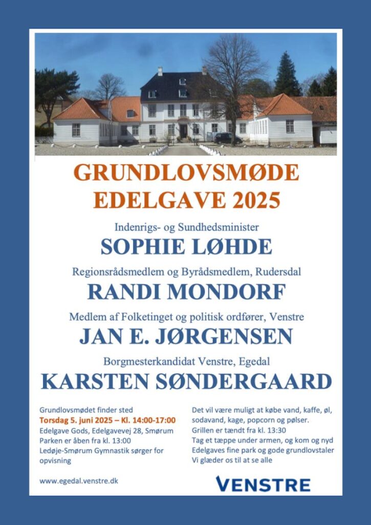 Venstre i Egedal inviterer til Grundlovsmøde p Edelgave gods, Edelgavevej 28, Smørum.